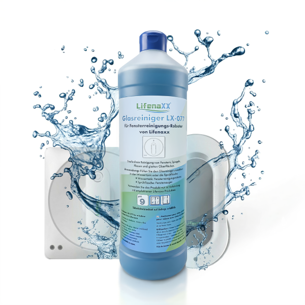 - Glass and mirror cleaner for Lifenaxx window robots, ready to use, cleans all glass surfaces, such as windows, mirrors and tiles, removing all types of dirt. The glass cleaner even removes oily, greasy residues and nicotine stains without leaving any residue, leaving surfaces streak-free and sparkling clean.
